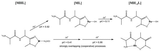 As Scheme 7 shows, with [(η6-p-cym)Ru]2+, the hydrolysis of the coordinated water above pH ca. 5 occurs, which completely prevents the metal-induced deprotonation of the peptide-amide, and thus, also prevents the formation of the complex with an (Namino,Namide,Ohydr.) binding mode, which, in turn, is the dominating chelating set in the system with [(η5-Cp*)Rh]2+ above pH 7.