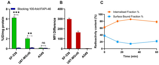 Specificity of 68Ga-FAPI-46 binding to SF-539, U87-MGvIII, and A549 cells (1 h, 4 °C), with or without pre-incubation with 100-fold molar excess of natGa-FAPI-46 (A). FAP expression in SF-539, U87-MGvIII, and A549 cell lines determined by flow cytometry (B). Internalization of 68Ga-FAPI-46 in SF-539 cells (C). Data are expressed as mean ± SEM (n = 3 independent experiments). Statistical significance is represented as ** p < 0.01 and *** p < 0.001, ns = not significant.