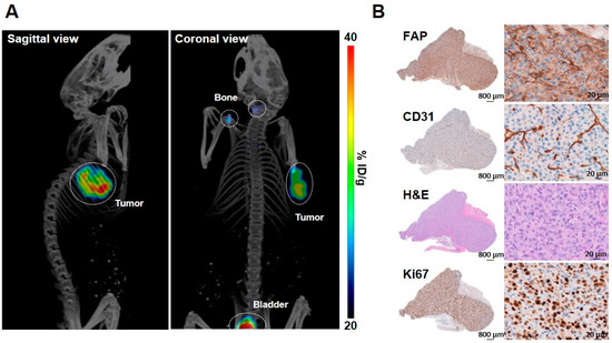 Representative PET/CT image of 68Ga-FAPI-46 in a mouse bearing subcutaneous U87-MGvIII tumor. Tumor, bladder and bone are outlined by a white circle (A). Representative U87-MGvIII tumor sections stained with FAP, CD31, HandE, and Ki67 antibodies (B).