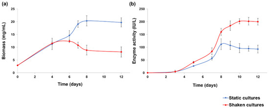 Very scarce literature deals with static liquid cultures for the production of chitinases, which are generally obtained in shaken (or stirred) cultures or in solid-state conditions [38]. In a couple of works, static cultures demonstrated to be more efficient than shaken cultures both for biomass and chitinase production by Aspergillus terreus and Alternaria alternata [39,40]. However, a preliminary test, to evaluate these different strategies for strain IG119, was planned. The tests demonstrated that static cultural conditions promoted best C. rosea IG119 growth (Figure 1a). By contrast, highest enzyme activity was achieved in shaken cultures reaching, after 10 days, the 181% of the maximum observed in static conditions (Figure 1b). Therefore, shaken cultures were selected for the subsequent experiments, also in view of possible better kinetic parameters (productivity and specific production), due to the lower biomass production in relation with the increased enzyme activity.