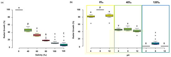 Box plots of radial growth by Clonostachys rosea IG119 on solid media. (a) Growth at different salinities at pH 8. (b) Growth at different pHs and salinities. All data collected daily during the experiment (16 days) were standardized on daily maximum. The same greek letters over the boxes indicate not significant differences among data, as determined by the post hoc test (p < 0.005).