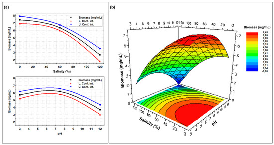 Single (a) and combined (b) effects of different pHs and salinities on the biomass production by Clonostachys rosea IG119 as reported by the RSM model.