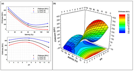 Single (a) and combined (b) effects of different pHs and salinities on the chitinolytic enzyme production by Clonostachys rosea IG119 as reported by the RSM model.