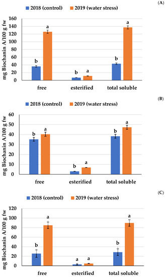 To the best of our knowledge, there are no published studies on the effects of severe water stress on the biochanin A concentration in chickpeas. The concentration of total biochanin A (Figure 1) was up to 3.2 times higher in the second season (water stress) than in the first season (water stress). This overall increase reflected the increment in both the free (up to 3.5-fold) and esterified (up to 2.3-fold) biochanin A concentrations. Finally, our results suggest that water stress preferentially modulates the biosynthesis of free rather than esterified biochanin A. This possibility merits further investigation.