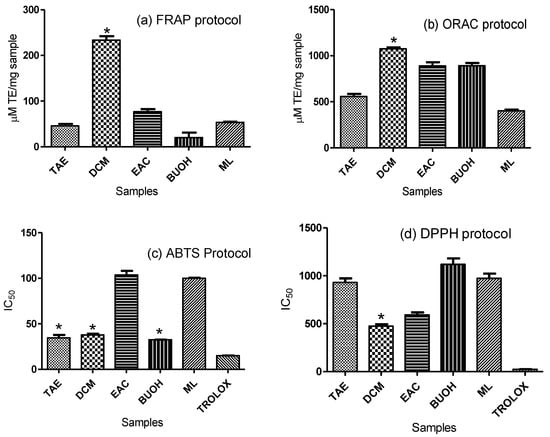 Serial dilutions of the 5 samples—total aqueous extract (TAE) and fractions thereof viz. (DCM), (EAC), (BUOH), and (ML)—were prepared in concentrations of µg/mL for carrying out the array of antioxidant examination procedures as will be described within each protocol.