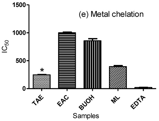 Antioxidant activities of aqueous celery extract and fractions thereof assessed by: (a) FRAP, (b) ORAC, (c) ABTS, (d) DPPH, (e) metal chelation protocols. TAE: total aqueous extract, DCM: dichloromethane fraction, EAC: ethyl acetate fraction, BUOH: butanol fraction, and ML: remaining mother liquor. In metal chelation protocol (e): DCM fraction was not detectable by this assay. *: significant antioxidant activity.