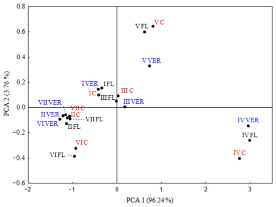 Figure 2 shows the distribution of the average concentrations of the seven groups of volatile compounds (I: aliphatic esters (up to C8); II: aliphatic esters (C9 and higher); III: aliphatic alcohols; IV: aromatic esters and alcohols; V: ketones; VI: aldehydes; and VII: monoterpenoles and monoterpenes) determined in wine made from the control and two defoliation treatments. The first component explained 96.24% of the variation. The wines were most affected by defoliation treatments in 2018, where aromatic esters and alcohols (IV) were separately positioned on the positive lower part of PC1. Three groups of compounds (VII: monoterpenoles and monoterpenes; VI: aldehydes; and II. aliphatic esters (C9 and higher)) that remained unaffected by any treatments in 2017 were positioned on the negative side of PC1 and the negative side of PC2. The effect of leaf removal in 2017 was significant for the aliphatic esters (up to C8) that were positioned on the negative sides of PC1 and PC2. aliphatic alcohols from the C and FL wines were very closely positioned on the zero values of PC1, while those from the VER wine were slightly separated at the positive side of PC1 and had zero value for PC2. Ketones (group V) from three different treatments were singled out in the above positive part of PC1.