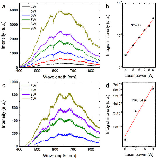 Figure 1. The emission spectra of laser-irradiated graphene foam with different excitation laser power in saline (a,b) and distilled water (c,d). The narrow dips observed at ~589 nm in the emission spectrum of saline water may be assigned to the Na+ ions due to the dissociation of NaCl. They were not seen for distilled water.