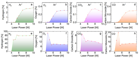 Figure 2. The power dependence of gas products in (ad) and without (eh) the presence of Ar, resulting from laser irradiation of H2O +1% NaCl.
