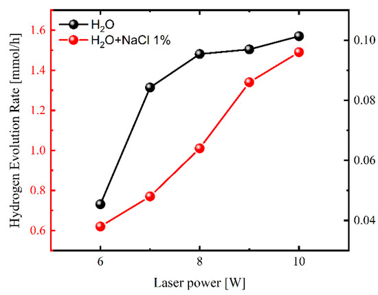 The excitation laser power dependence of the hydrogen evolution rate of distilled and saline water is shown in Figure 3. The total flow of H2 was determined to be 1.61 mmol/h and 0.10 mmol/h under the highest power of applied IR laser 10W for saline and distilled water, respectively.