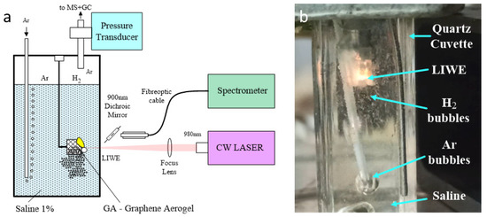 Figure 5. Experimental set-up for hydrogen generation from water, using graphene as a photocatalyst (a); Photo of the cuvette of water with immersed graphene scaffold irradiated with 980 nm laser beam (b).
