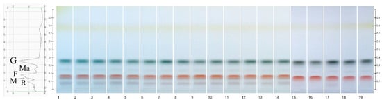 Images of HPTLC plates taken after derivatization by aniline—diphenylamine—phosphoric acid reagent in visible light, presenting sugars separation. Tracks 1–14—honeydew honeys, 15—heather, 16—acacia, 17—multifloral, 18—buckwheat, 19—rape honeys. (R—raffinose, M—melezitose, F—fructose, G—glucose, Ma—Maltose).