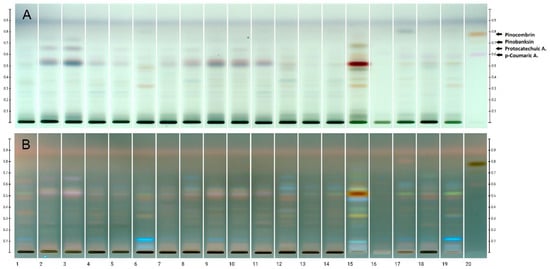 Images of HPTLC separation of honeydew (tracks 1–14) and nectar honeys (track 15—heather, 16—acacia, 17—multifloral, 18—buckwheat, 19—rape) after p-anisaldehyde derivatization, in UV 366 nm light (A) and visible light (B). Track 20 standards (in order of increasing Rf values): p-coumaric acid, protocatechuic acid, pinobanksin, pinocembrin.