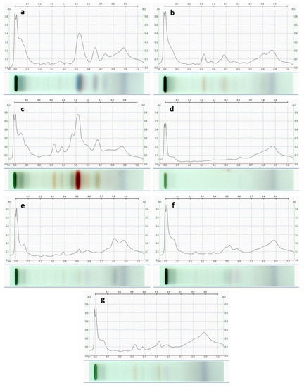 HPTLC polyphenolic profile to distinguish fir honeydew honey tested samples (a,b) and other nectar honeys: heather (c), acacia (d), multifloral (e), buckwheat (f), and rape (g).