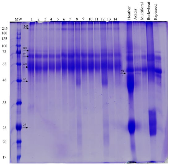 Detailed analysis of the protein profiles obtained with ImageJ software clearly indicates that the presence of a 245 kDa band is distinctive from honeydew honey. In all these samples, a repetitive band pattern on the gel is also visible: besides the already mentioned 245 kDa, there is also 80, 70, and a wide band of 60 kDa, which can be considered a specific fingerprint for honeydew honey. In two samples (8 and 12) additional 48 kDa and 25 kDa bands are also visible, but this result seems nonspecific and could be an effect of adulteration or nectar admixture (Figure 5). On the other hand, the presence of low-molecular-weight bands is characteristic for some nectar honeys: 55 kDa in acacia and rapeseed honey and 48 kDa in heather, acacia, and rapeseed honeys, and 25 kDa in all nectar honeys, probably of floral origin (Figure 5).