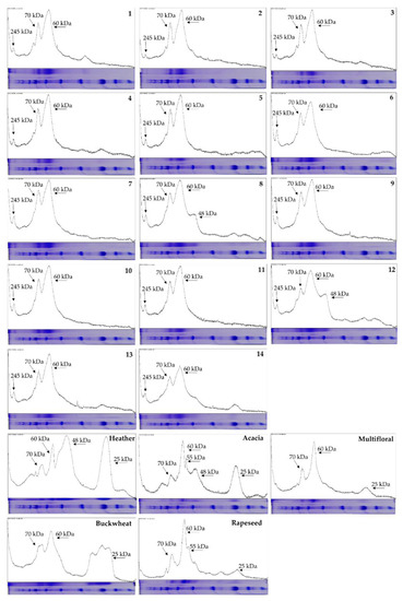 Detailed qualitative analysis of particular SDS-PAGE gel lanes obtained for honeydew honey samples (1–14) and nectar honeys in ImageJ software.