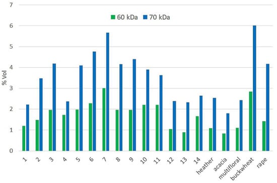 As the most intense bands on the gel obtained were those of 60 and 70 kDa, it was decided to perform a comparative quantitative analysis on a CBB-G250 stained gel using ImageMaster 2D software. This analysis did not provide conclusive results. Nevertheless, it can be clearly observed that the %Vol values obtained for the samples of honeydew honey with nectar admixture (1, 12, 13, 14) are similar to those of heather, acacia and multifloral honey. On the other hand, this parameter for pure honeydew honeys shows higher values similarly to buckwheat honey (Figure 6). The protein profile was previously successfully used for differentiation between honeydew honey and blossom honeys [63].