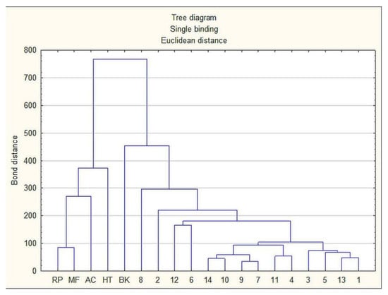 Tree diagram based on the average values of the physicochemical parameters and antioxidant activity between honeydew honeys and nectar honeys (complete linkage, Euclidean distance). (RP—rape, MF—multifloral, AC—acacia, HT—heather, BK—buckwheat).