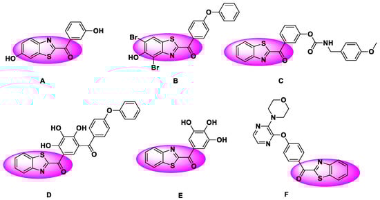 Benzothiazole skeletons exist as key building blocks in natural products, drugs and agrochemicals and exhibit potent and diverse biological activities [1,2,3,4]. The benzothiazole scaffold is considered to be one of the most important substructures for drug discovery due to its various biological effects, including anti-cancer, anti-oxidant, anti-inflammatory, anti-microbial, anti-fungal, anti-convulsant, and anti-viral activities [5,6,7,8,9,10,11]. Among them, C2-arylacylated benzothiazole derivatives have attracted considerable attention in recent years due to their great potential as new drug candidates. For instance, as shown in Figure 1, 6-hydroxybenzothiophene ketone A exhibits potential for the treatment of breast cancer, endometriotic tissues, and other diseases by functioning as an inhibitor of 17b-hydroxysteroid dehydrogenase Type 1 (17b-HSD1) [12,13,14]. C2-arylacylated benzothiazole B act as a novel structural class of Ca2+/calmodulin-dependent protein kinase II (CaMKII) inhibitors with the potential to be developed as anti-inflammatory agents [15]; 2-Benzothiazolyl-phenylmethanone C were found to be potent fatty acid amide hydrolase (FAAH) inhibitors with beneficial effects for disorders such as pain and inflammation [16]. As a potent inhibitor of antiapoptotic Bcl-2 proteins, acylpyrogallol D inhibited growth and induced apoptosis in human breast and prostate cancer cell lines [17]. Keto-benzothiazole E acted as a potent antiproliferative agent for melanoma [18], while F can potentially treat schizophrenia by inhibiting PDE10A [19].