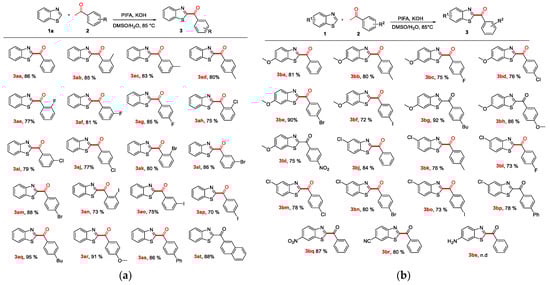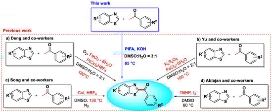 In recent years, PIFA has received significant attention as a mild, low-toxic, and selective reagent in organic synthesis, which can also be used as an effective alternative to toxic, heavy metal-based oxidants, and expensive organometallic catalysts [33,34,35]. In line with our continuous efforts to extend the C2-functionalization methods for 2H-benzothiazoles [36,37,38,39,40], herein we report a novel, convenient, and efficient PIFA/KOH method which synergistically promotes the C2-arylacylation of 2H-benzothiazoles with aryl methyl ketones, affording a wide variety of 2-arylacylated products with good yields. Our process also has the advantages of mild reaction conditions and being transitional metal-free.