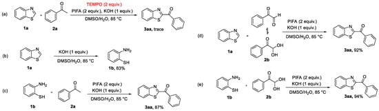In addition, a series of controlled experiments were used to explore the reaction mechanism as follows: (A) Two equivalents of the radical trap 2,2,6,6-tetramethyl-1-piperidinyloxy (TEMPO) were added to the mixture under optimal reaction conditions (Figure 5a). TEMPO, a known radical scavenger, will intercept the free radicals generated by the reaction, thus inhibiting the progress of the reaction [27]. The results indicated that the reaction was almost completely inhibited by TEMPO, with only a trace amount of 3aa being detected. (B) The reaction mechanism behind the ring-opening of the 2H-benzothiazole was explored. The 2H-benzothiazole was transformed into 2-aminothiophenol (1b) in 83% yield under standard conditions (Figure 5b). (C) The reaction between 2-aminothiophenol (1b) and acetophenone (2a), under optimized reaction conditions, formed the target product (3aa) in 87% yield, which was close to that of the reaction between 2H-benzothiazole and acetophenone (86%, Figure 4, 3aa). This confirmed that the transformation might proceed via a ring-opening pathway. (D) The reaction between 2H-benzothiazole (1a) and 2,2-dihydroxy-1-phenylethan-1-one (2b) afforded 3aa in 92% yield (Figure 5d). This result demonstrated that acetophenone (2a) was oxidized to phenylglyoxal (2b). (E) The reaction of 2-aminothiophenol (1b) with 2,2-dihydroxy-1-phenylethan-1-one (2b) afforded the desired product 3aa in 94% yield, suggesting that 2-aminothiophenol (1b) was the intermediate product (Figure 5e).