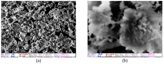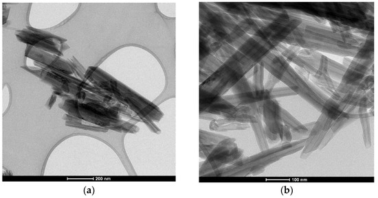 The HNT dry powders are examined by using a LEO 1440 XB scanning electron microscope (SEM) (LEOGmbH, Oberkochen, Germany) at 5 kV with a secondary electron detector at a high vacuum mode and Philips CM20 transmission electron microscope (TEM) (Philips, Eindhoven, Netherlands) at 200 kV to know the morphology and structure of the powder. In Figure 3, two SEM pictures are presented at different magnification powers. In Figure 3a with the 10 K(x) zoom, the morphology appeared to be bulky conglomerates. This showed that HNTs tend to stick together. Figure 3b with 100 K(x) clearly shows and confirms the tubular structure that has been suggested in the literature. Furthermore, the dimensions of the HNTs are as follows: the length is in the range of 100–300 nm, while the diameter is ca. 30–50 nm. Figure 4 shows two TEM images of HNTs. Based on this figure, it confirms the tubular morphology of the used halloysite.
