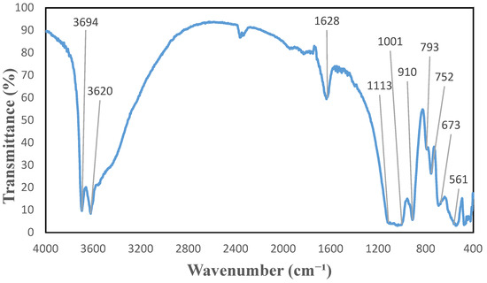 KBr pellets are used to characterize HNT powders using Excalibur FTS 3000 Bio-Rad Fourier-transform infrared spectroscopy (FTIR) equipment (Bio-Rad, Digilab, UK) in the region of 400–4000 cm−1 with a resolution of 1 cm−1 in transmittance. In Figure 6, FTIR spectrum of halloysite can be seen. All peaks below 600 cm−1 are said to be due to stretching, bending, and a combination of Si-O-Si. Al-O-Si bonds vibrations can be seen with a peak at 561 cm−1. The peak at 752 cm−1 is said to be due to the vibration of Al-O-Si [29]. At 910 cm−1 the vibration of inner hydroxyl groups is presented. Strong signaled stretching of Si-O-Si bonds can be observed at 1001 cm−1. It also can be seen that inner hydroxyl groups are presented at 1628 cm−1 as well. The peak 3620 cm−1 is also due to the inner hydroxyl (O-H) groups [29].