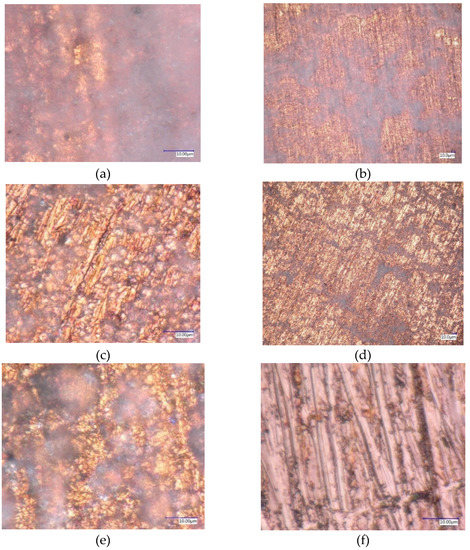 Deposition of the nanoparticles (a) 5000× for 0.5 vol%, (b) 500× for 0.5 vol%, (c) 5000× for 0.05 vol%, (d) 500× for 0.01 vol%, (e) 5000× for 0.1 vol%, and (f) 5000× Clean sample (without deposition).