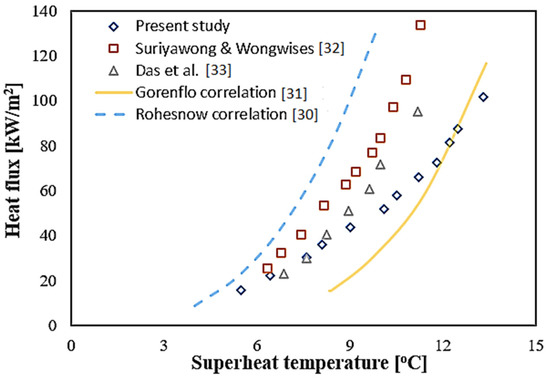 In order to confirm the reliability of the boiling chamber, DI water is used for investigation on PBHT. Then, the results of the pool boiling cure for DI water are compared with the previous studies [30,31,32,33], as shown in Figure 8. From the results, it can be seen that the experimental results in the present study can be accepted.