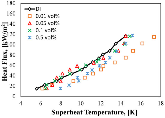 Figure 9 shows the relationship between HF against the superheat temperature (∆Tsup = Tw − Tsat). This kind is defined as the pool boiling curve for the base fluid, and HNT nanofluids. Because of the power restriction of the cartridge heater utilized in this study, the maximum applied HF employed for all experiments does not surpass 118 kW/m2, which indicates that all experiments are performed below the critical HF value. As shown in the figure below, as the applied HF was raised, the superheat temperature has risen up with a fairly minor difference in temperature for both of the halloysite nanofluid and DI, and that is because of the nucleate pool boiling mechanism, which the vaporization heat represented. Moreover, it can be noticed that at the 0.05 vol% concentration the curve moves to the left side of the graph as compared to DI water at HF values ranging from 36.3 to 58.8 kW/m2 with superheat temperatures values 7.6 to 9.6 K. Moreover, there was a very slight enhancement with 0.1 vol% concentration curve, as it can be seen about the minor left shifting in its curve at HF values from 30 to 60.3 kW/m2 with superheat temperatures values 7.4 to 10.5 K and after these values as both of the HF and the superheat temperatures further increase, the curves start to move to the right side of the graph, and that means a deterioration in the HT process. However, increasing the concentration of the nanofluid significantly changes the boiling curve toward the right. Exceptionally, with high HF values, the shift is remarkable. Moreover, as the process was running forward, HF and superheat temperature kept rising, and at the same time, the pool’s boiling performance worsened. This might be linked to the nanoflakes accumulating on the surface of heating tube under the boiling phase. The result is that an insulation thermal layer preventing the HT between the heating tube and the working fluids is created. This explanation was used by several researchers [18,32,34].