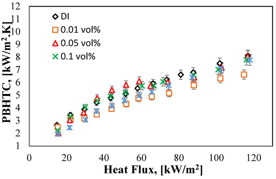 Figure 10 shows the proportional relationship between the HF, q [kW/m2], and PBHTC, [kW/m2K]. From the graph, it can be told that there is an improvement in the PBHTC for the volume concentrations of (0.1% and 0.05%). The enhancement of 0.1 vol% curve as compared to DI water started at 30 [kW/m2] HF and 4.05 [kW/m2K] to reach the maximum enhancement PBHTC of 5.74 [kW/m2K] at 60.3 [kW/m2] of the HF. While the 0.05 vol% curve has the best HT process among all the other concentrations, as it increased by moving to the left side of the graph when the HF value reached 36.27 [kW/m2] with 4.77 [kW/m2K] of PBHTC and continued rising until it hits the highest value of the PBHTC at 6.10 [kW/m2K] with 58.8 [kW/m2] HF. However, after reaching the peak, the curves for both the abovementioned concentrations started to deteriorate as the boiling process moved forward with time. The reason behind this increment is related to the good TC of the halloysite nanofluid as well as the small volume concentrations of the nanofluids (0.1% and 0.05%) that helped in increasing the HT.