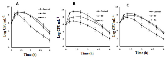 Colony count of the infected aqueous humor after the topical application of B0 and A3 formulations and Ciloxan® eye drops against S. aureus (A), K. pneumonia (B), and P. aeruginosa (C), (mean ± SD, n = 3.0).