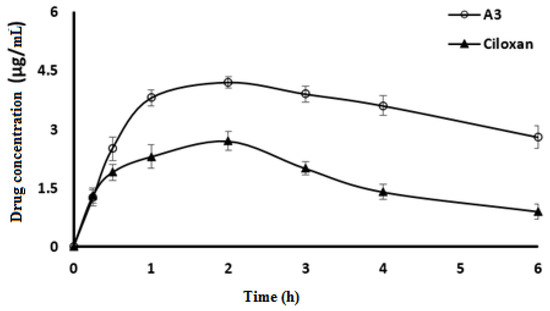 Based on the data obtained from the physiochemical and antimicrobial evaluations of the prepared CPX ophthalmic formulations, formulation A3 was selected for in vivo pharmacokinetic experiment along with the commercial CPX eye drops, Ciloxan®. Fifty μL dose of CPX ophthalmic formulation was applied in the lower conjunctival sac of the rabbit’s right eye; however, Ciloxan® (Riyadh Pharma, Riyadh, Saudi Arabia) was applied in the left one. The animals were euthanized after withdrawing the aqueous humor at specific time intervals. The samples were centrifuged for 20 min at 4 °C and 20,000 rpm and supernatant were frozen at –20 °C until assay. The amount of CPX in each sample was analyzed using the HPLC method described above [27].