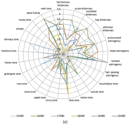 As a result of the descriptor analysis, profilograms of beer samples were obtained during the expert evaluation of beer samples (Figure 1a–c).