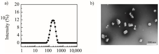 Using the “top-down” principle, the media-milling method was applied to prepare NRG-NSps. The magnetic stirrer served as the power device, the vial was the milling chamber, and the zirconia ball was used as the milling medium to prepare NRG-NSps. The feed–weight ratio of NRG vs. TPGS was designed as 4/1. After stirring for 2 h, NRG-NSps was prepared successfully as a white milky liquid, and the drug-loading content was 66.7%. The particle size of NRG-NSps was 216.9 nm. The particle size distribution curve is shown in Figure 1a. Transmission electron microscopy (TEM) images revealed that NRG-NSps presented a flaky morphology (Figure 1b), which is different than the appearance of nanospherical particles reported in previous papers [32,33].