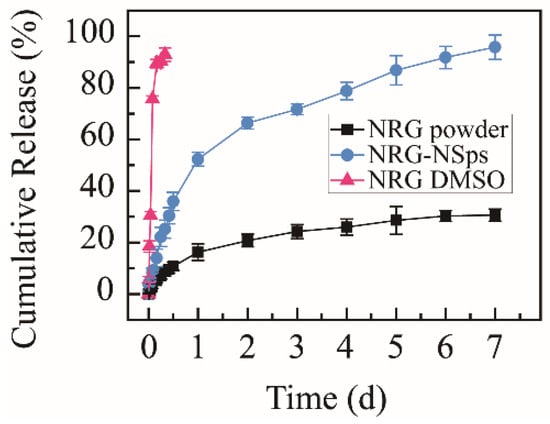 Cumulative release curves of NRG-NSps, NRG powder, and NRG DMSO solution in PBS (pH 7.4) at 37 °C.