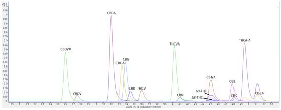 All reagents, water with 0.1% formic acid (mobile phase A), acetonitrile with 0.1% formic acid (mobile phase B), and methanol were HPLC grade and obtained from Fisher Scientific (Fair Lawn, NJ, USA). Primary standards for cannabidiolic acid (CBDA) tetrahydrocannabinolic acid (THCA-A) in acetonitrile, cannabidivarin acid (CBDVA), cannabidivarin (CBDV), cannabigerolic acid (CBGA), cannabigerol (CBG), cannabidiol (CBD), tetrahydrocannabivarin (THCV), tetrahydrocannabivarin acid (THCVA), cannabinol (CBN), cannabinolic acid (CBNA), tetrahydrocannabinol (THC), delta-8-tetrahydrocannabinol (Δ8-THC), cannabicyclol (CBL), cannabichromene (CBC), and cannabichromenic acid (CBCA) in methanol, at 1000 µg/mL, were commercially purchased from Novachem Pty Ltd. (Heidelberg West, Australia) as distributor for Cerilliant Corporation (Round Rock, TX, USA). Purity of standards were >98% according to the individual certificate of analysis.