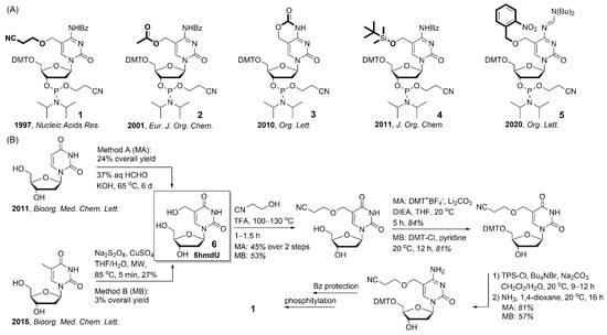 5hmdC Phosphoramidites with different protecting groups (A) and two improved synthetic methods for 5hmdC phosphoramidite 1 (B).