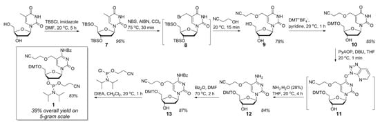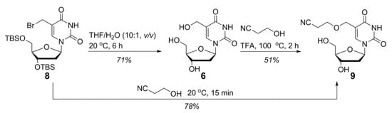 Originally, we found that 5hmdU (6) could be efficiently obtained by hydrolyzing 5BrmdU (8) with TFA/H2O (10:1, v/v) in 71% yield. However, the following synthesis of cyanoethyl ether in the presence of TFA at 100 °C according to the previous reports [26,27] yielded the desired 9 in only 51% yield. Therefore, we abandoned the synthesis of 5hmdU and subsequent condensation with cyanoethanol under harsh conditions. Instead, we attempted to convert 8 directly to cyanoethyl ether 9 via alcoholysis with cyanoethanol under mild conditions. The simultaneous alcoholysis and cleavage of TBS by HBr generated in situ only took 15 min at ambient temperature, and column purification afforded 9 in 78% yield (Scheme 2).