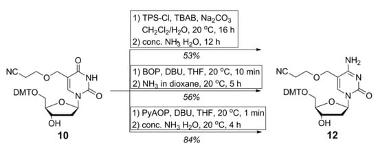 - Hansen, A.S.; Thalhammer, A.; El-Sagheer, A.H.; Brown, T.; Schofield, C.J. Improved synthesis of 5-hydroxymethyl-2’-deoxy-cytidine phosphoramidite using a 2’-deoxyuridine to 2’-deoxycytidine conversion without temporary protecting groups. Bioorg. Med. Chem. Lett. 2011, 21, 1181–1184. [Google Scholar] [CrossRef]