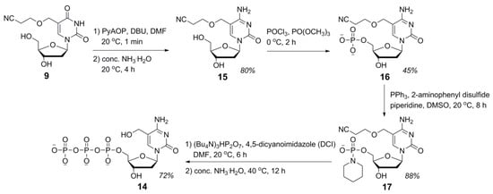 As mentioned above, 5hmdC triphosphate (14) is the key substrate for PCR-based 5hmdC-containing DNA synthesis. Previously, we have reported a synthetic route for 14, starting from acetyl/diTBS-protected 5hmdC [31]. The current synthetic advances made in the preparation of cyanoethyl/DMT-protected 5hmdC phosphoramidite (1) offered an excellent opportunity to gain more efficient accesses to 14.