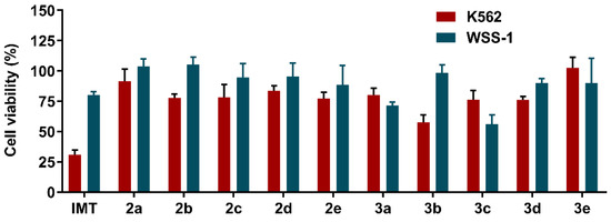 Screening of imatinib and its 2a–e and 3a–e derivatives at 10 μM concentration, against human cell lines K562 (in red) and WSS-1 (green). Bars represent the mean ± standard deviation.