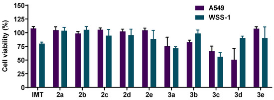 Screening of imatinib and its derivatives 2a–e and 3a–e at a concentration of 10 μM against human cell lines A549 (purple) and WSS-1 (green). Bars represent the mean ± standard deviation.