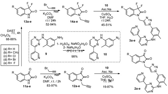 Initially, commercially available isatins (11a–e) were N-alkylated with propargyl bromide to generate 1-propyl-indoline-2,3-dione derivatives (12a–e) at an 83–97% yield (Scheme 1). Compounds 12a–e were characterized, and the data were in agreement with the literature [19,20]. N-(5-Azido-2-methylphenyl)-4-(pyridin-3-yl)pyrimidin-2-amine (10) was prepared via an aromatic nucleophilic substitution reaction, through the formation of a diazonium salt using intermediate 9. This compound was obtained at a 98% yield and was characterized; the data were in agreement with the literature [19].