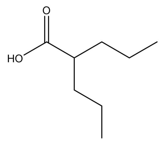 Valproic acid (Figure 1) and its salts are drugs with anticonvulsant activity used in the treatment of severe neurological diseases. They have also found application in the treatment of mania in bipolar disorder [1]. Valproic acid alleviates central nervous system (CNS) injuries and improves functional results after acute CNS damage by multiple pathways, including anti-inflammatory, anti-apoptotic, and neurotrophic effects [2]. Recent reports indicate that valproic acid can be used in the treatment of breast cancer [3] and in chronic lymphocytic leukemia [4].