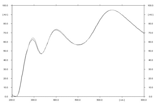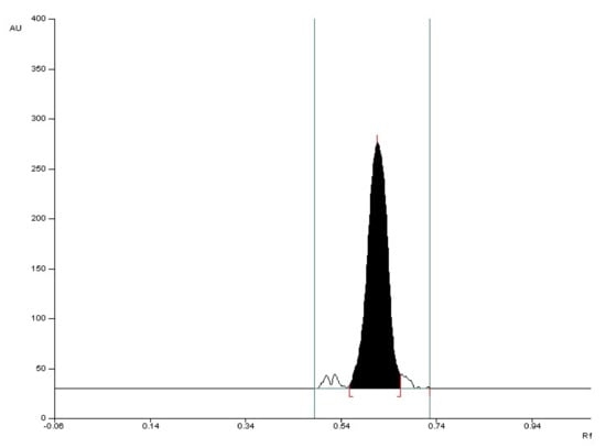 The selectivity of the method was established by comparing the RF values of the valproic acid standard and valproic acid coming from Convulex drug samples and their spectrodensitograms. The RF values of the valproic acid standard and valproic acid coming from Convulex drug samples were 0.57 ± 0.05 in each case. Compatibility in RF values (Figures 3, 4, 6 and 7) was obtained (RF is always equal to 0.57 ± 0.05) and in the spectra of valproic acid standard and valproic acid coming from the Convulex drug (Figures 5 and 8) detected on the chromatographic plate by both detection methods, i.e., A (valproic acid detected using 2% CuSO4 solution) and B (valproic acid detected with 2′,7′-dichlorofluorescein-aluminum chloride-iron [III] chloride). It can be concluded that TLC technique combined with densitometric analysis can be used for the quantitative determination of valproic acid in pharmaceutical preparations by analyzing the densitogram of valproic acid coming from Convulex capsules and comparing their spectra. There are no noticeable impurities in the analysis, and the quantitative analysis is based on the measurement of the area of the chromatographic bands. Densitograms and spectrodensitograms are shown in Figure 3, Figure 4, Figure 5, Figure 6, Figure 7 and Figure 8. Thin layer chromatography combined with densitometry is highly selective for the determination of valproic acid in capsules.