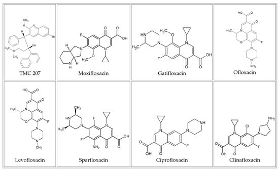 - Andries, K.; Verhasselt, P.; Guillemont, J.; Göhlmann, H.W.H.; Neefs, J.-M.; Winkler, H.; Van Gestel, J.; Timmerman, P.; Zhu, M.; Lee, E.; et al. A Diarylquinoline Drug Active on the ATP Synthase of Mycobacterium tuberculosis. Science 2005, 307, 223–227. [Google Scholar] [CrossRef] [PubMed]