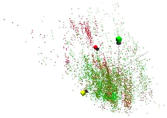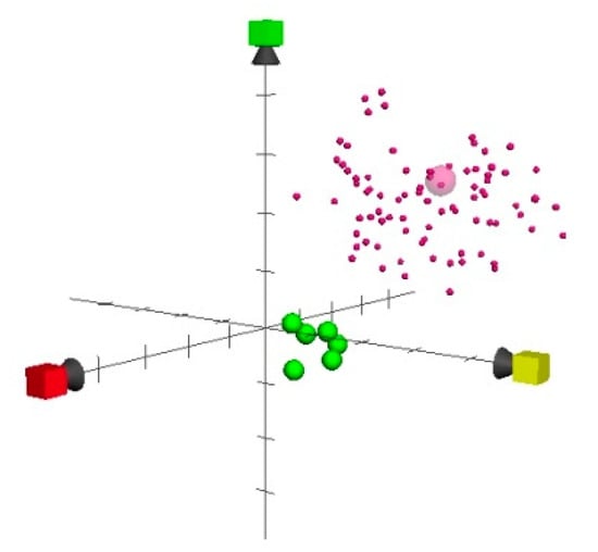Position of bedaquiline (large pink sphere), the 100 closest antituberculosis compounds (small spheres), and quinoline compounds (green spheres), using ChemGPS-NP scores, where PC1 (x = red), PC2 (y = yellow), and PC3 (green).