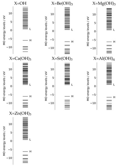 Energy levels of molecular orbitals of each ground state for X–MnOH2 combined with N-metylformamidine. “H” and “L” respectively, indicate HOMO and LUMO, which are well separated, commonly with about 5 eV gap energy.