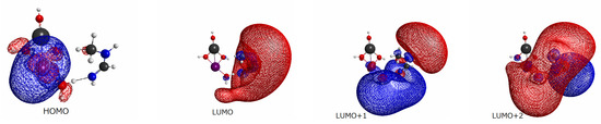 We next surveyed the spatial distributions of the relevant molecular orbitals in the order of HOMO–(LUMO+2) for a systematic comparison among those for Be(OH) (Figure 4), Mg(OH) (Figure 5), and Sr(OH) (Figure 6). (The similar molecular orbitals for X=OH and X=Ca(OH) are presented in [20].) Those of X=Be(OH), Al(OH), and Zn(OH) are not shown graphically, yet they have characteristics more-or-less similar to those of Figure 4, Figure 5 and Figure 6. These diagrams share significant features. We first note that MOs from HOMO (and HOMO-1 and HOMO-2 as well, not shown here graphically) are localized in the EPD moiety (Mn-oxide complex), while LUMO and LUMO+1 tend to localize in the EPA site (N-methylformamidine). In particular, all the LUMOs shown here are made up with the Rydberg-like diffused orbitals on the N atoms. Such diffused vacant orbitals of LUMO suggest that they should serve an efficient electron acceptor. These common features are consistent with the large and clear energy gaps between HOMO and LUMO seen in Figure 3.